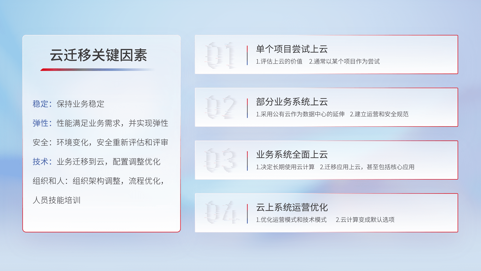 结合实际业务,,,从规划设计、、、、云平台选型、、、、云原生改造、、数据迁移、、集成交付,,,,迁移全过程为客户识别最佳上云路径,,,做好风险识别管理,,,,设计网络架构、、、、身份权限、、、、安全审计合规、、、操作审计、、日志审计、、监控告警策略、、多站点容灾设计等,,,,对云上基础设施进行整体规划,,,提升IT治理水平,,,,以满足弹性、、高可用、、、、高性能的需求。。。